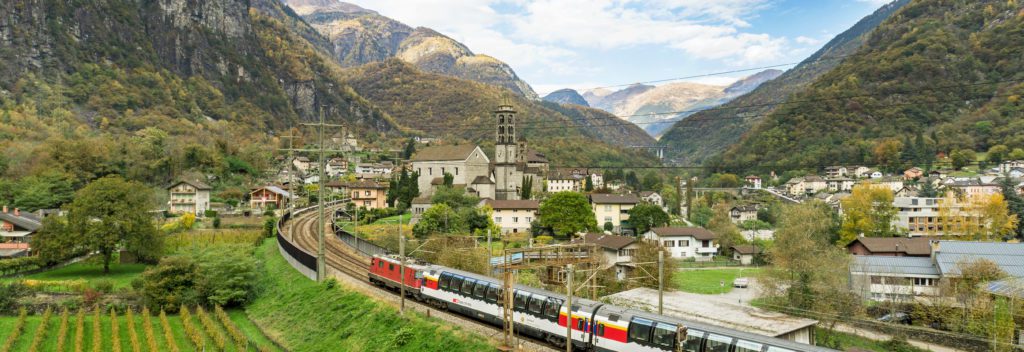 The original Gotthard Railway over the Alps opened in 1882. Travelling along this historic route, first, passengers pass through narrow valleys, spiral tunnels and across impressive stone viaducts as the line climbs into the dramatic Alpine landscape of the Gotthard Pass. Along the way, the scenery changes strikingly – from the chestnut forests and mild, Mediterranean-influenced climate of Ticino to the rugged high-mountain landscapes of central Switzerland or vice versa.